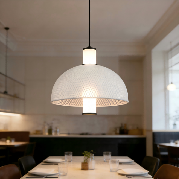 Įkvėptas pažangiausių dizaino tendencijų 2025 m. Milano Euroluce parodoje, šis minimalistinis itališkas šilko tinklelio pakabinamas Strong Lighting šviestuvas sklandžiai sujungia itališką minimalizmą su praktišku funkcionalumu. Centrinis 15 W LED šviesos šaltinis skleidžia 4000K neutralią šviesą, sukurdamas patogią atmosferą. 1500 LM ryškumas ir aukštas Ra>80 spalvų perteikimo indeksas, todėl šviesa yra natūrali ir tikroviška, todėl tinka svetainėms, valgomiesiems ir kitoms erdvėms. Apvalus arkos formos šviestuvo gaubtas pagamintas iš geležinio tinklelio, apvynioto aplink baltą šilko audinį, o matinės juodos spalvos detalės padengtos purškiamais dažais, kad suteiktų tekstūrą. Paprastas dizainas lengvai įsilieja į šiaurietišką, modernų ir kitus namų stilius.