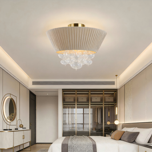 Ilgai dirbdama Europos ir Amerikos rinkose, Strong Lighting visada daug dėmesio skyrė galutinių vartotojų estetiniams poreikiams ir naudojimo scenarijams. Šio lubinio šviestuvo medžiaginis gaubtas pagamintas naudojant rankomis presuotos tekstūros technikas, sukuriant natūralią ir trimatę klostuotą tekstūrą. Jo skleidžiama šviesa yra minkšta ir tolygiai paskirstyta, todėl sukuriama šilta ir patogi apšvietimo aplinka. Apačioje kabantys stiklo burbuliukai yra išpūsti rankomis, kiekvienas turi šiek tiek kitokią formą. Šviečiant jie atrodo kaip pakabinti šviesos karoliukai, sukuriantys dinamišką ir žavų šviesos ir šešėlių efektą. Nesvarbu, ar jis naudojamas šiaurietiškoje minimalistinėje gyvenamojoje erdvėje, ar lengvo prabangaus stiliaus komercinėje vietoje, jis gali žymiai pagerinti erdvės kokybę.